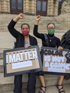 The speakers talked about justice for George Floyd and fighting racism. Then, we knelt while someone called out the names of the black people who have been killed by the police. After each name, we called out “Say his name” or “Black Lives Matter”. We also laid down with our hands behind our back to experience 8 minutes 46 seconds. It felt like a very long time to me. Imagine someone strangling you over the course of that time. It was a powerful reminder of what’s at stake here; it’s a matter of life and death.