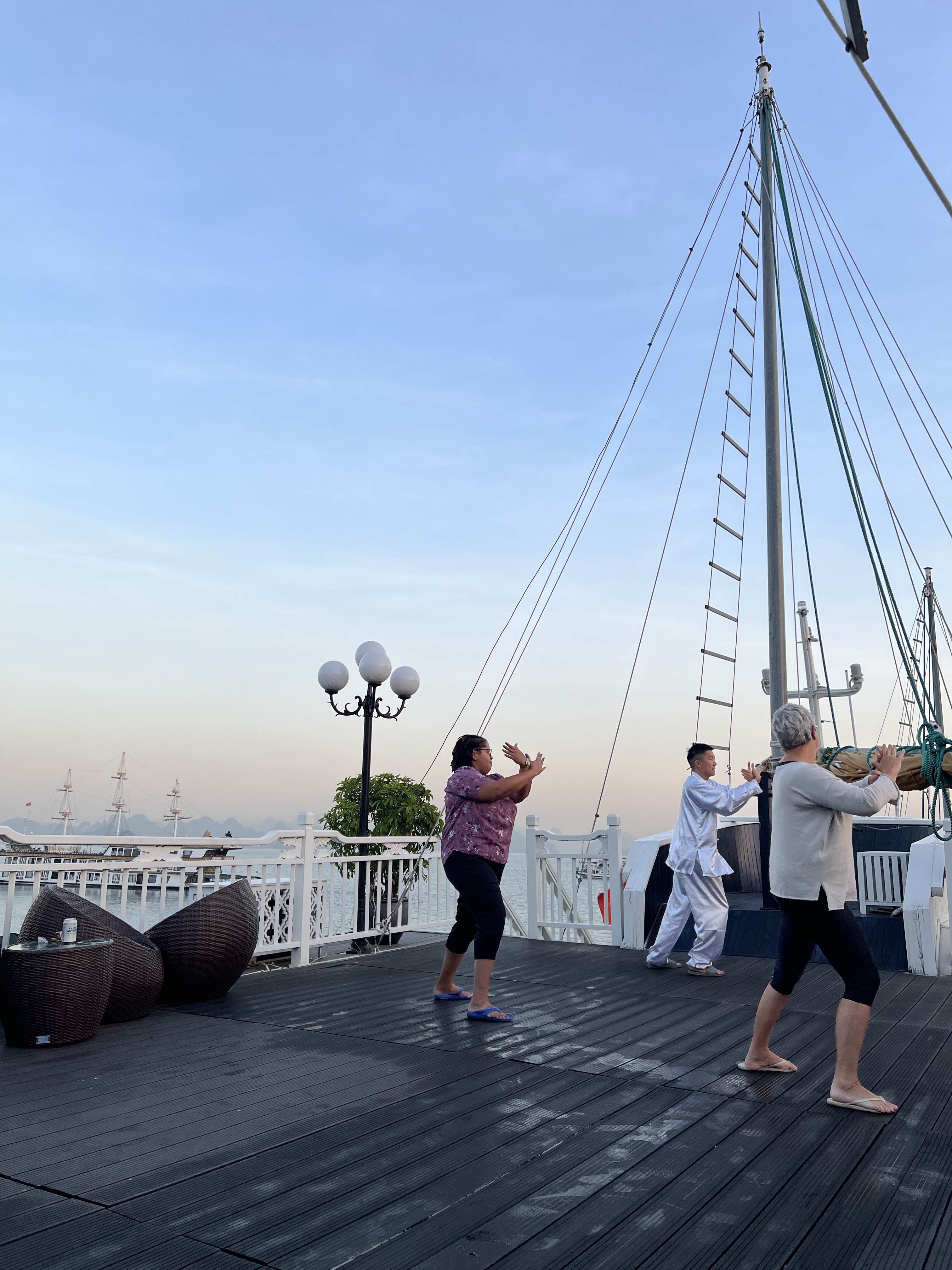 I work up at 5:45am to join tai chi at 6:15. I did not look nearly as elegant as Mr. Morning but it was a nice warm up and I got to see the sunrise.