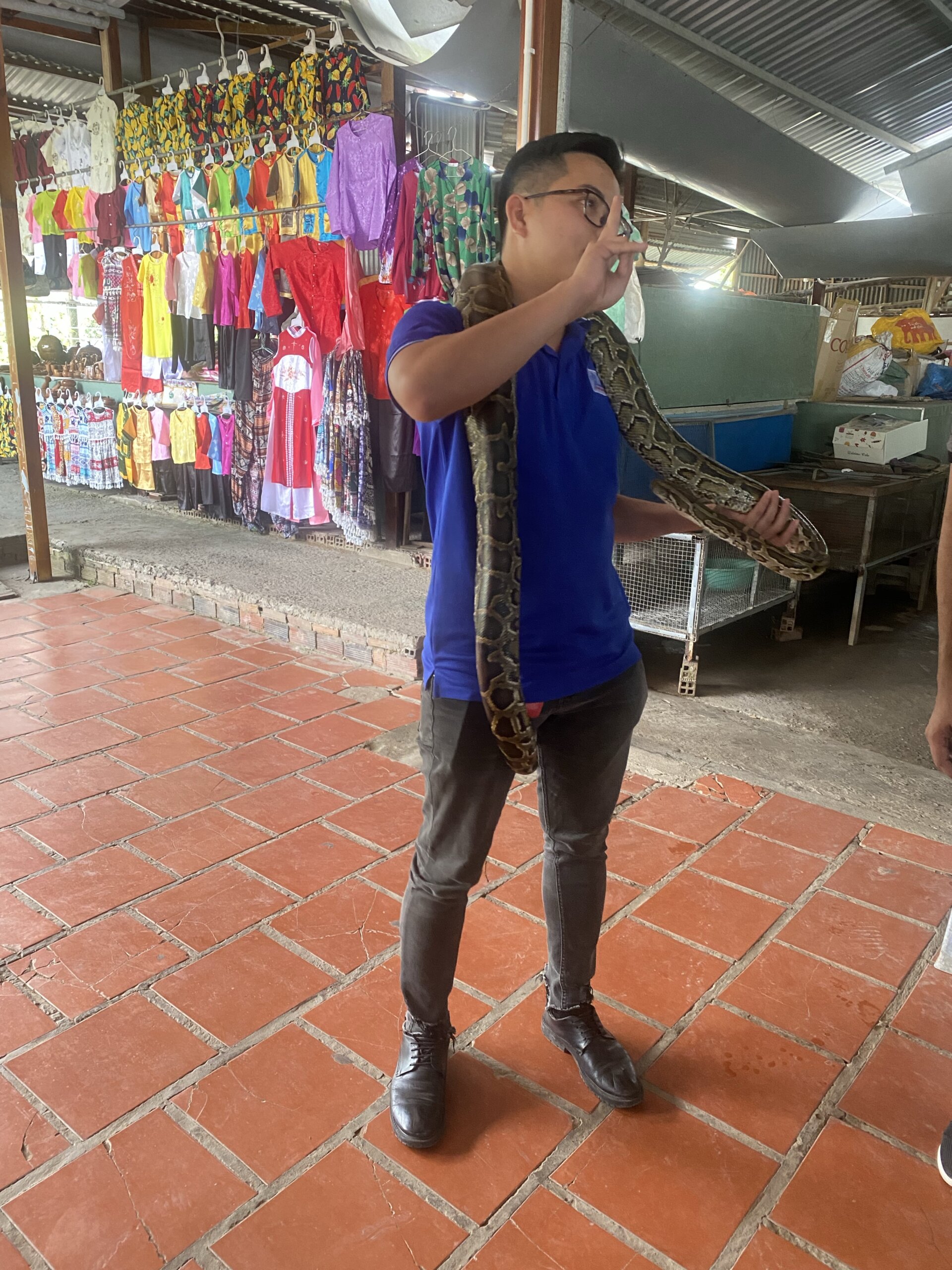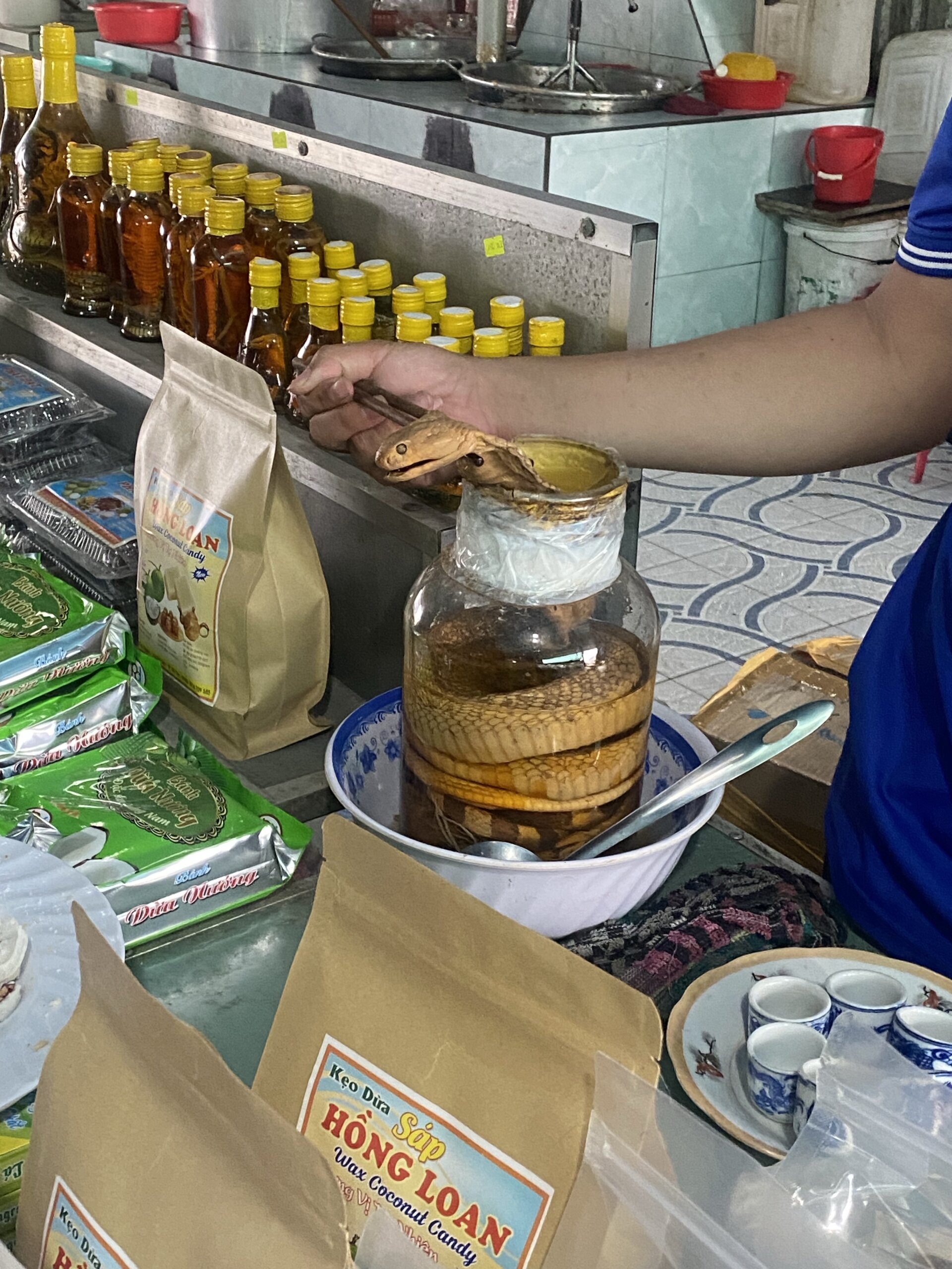 At My Tho, we took a boat ride to a small island. There, we were served honey tea, fried honey-sweetened banana and royal jelly and given a chance to purchase them. Next, we saw one of the racks from a bee hive and could hold a snake if interested.