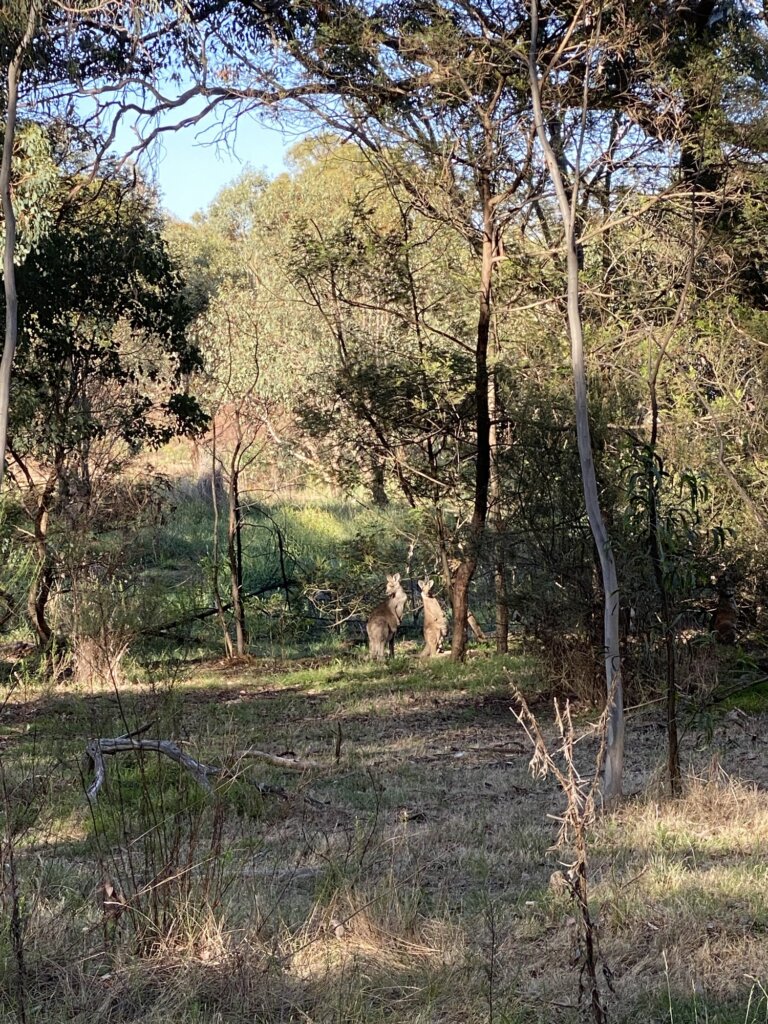 We stayed with friends of D’s in Canberra. On Saturday. I woke up early because I was promised kangaroos in the wild. We went to Mount Ainslie and did a short walk. At one point, someone pointed out a kangaroo. Imagine my delight to find 3 kangaroos. I walked towards them and they stood, unmoving, watching my approach and D’s. Promised and delivered!